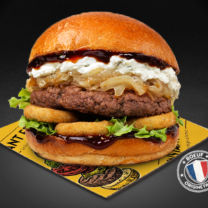 Pain Brioché Artisanal, Steak Frais🥩(130Gr) de Bœuf origine 🇫🇷, Sauce California exclusive, Bleu d’Auvergne AOP, Philadelphia, Salade, Oignons Rings.