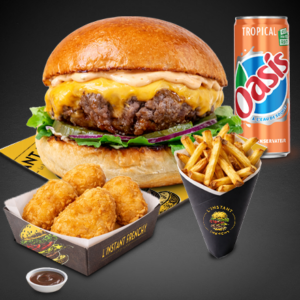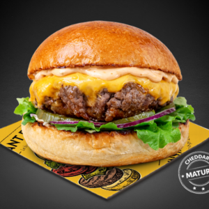 Pain Brioché Artisanal, Steak Frais🥩(130Gr) de Bœuf origine 🇫🇷, Sauce Burger exclusive, Cheddar maturé, Salade, Cornichons, Oignons Rouges.