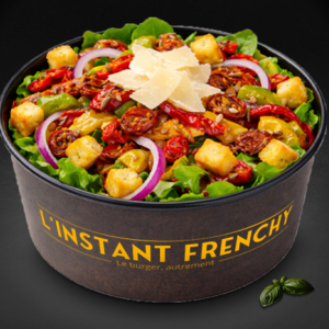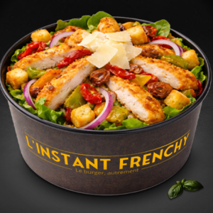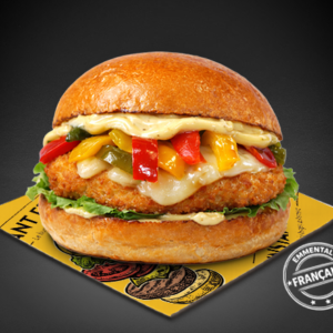 Steak de Poulet Haché Pané 130Gr fait Maison, Sauce Chicken Burger exclusive, Emmental AOP , Salade , Poivrons Confits Maison