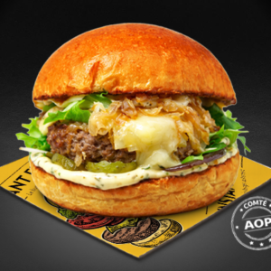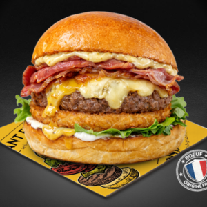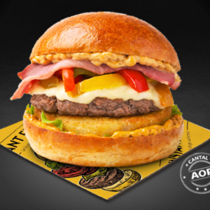 Pain Brioché Artisanal, Steak Frais🥩(130Gr) de Bœuf origine 🇫🇷, Sauce Américaine du Chef (relevée) 🌶, Cantal AOP, Galette de Pommes De Terre, Salade, Bacon de Boeuf et Poivrons Confits Maison