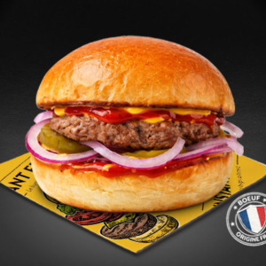Pain Brioché Artisanal, Steak Frais🥩(130Gr) de Bœuf origine 🇫🇷, Cornichons, Oignons Rouges, Ketchup Heinz, Moutarde Miel.