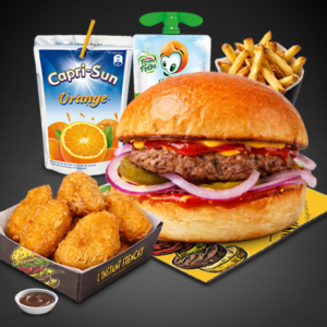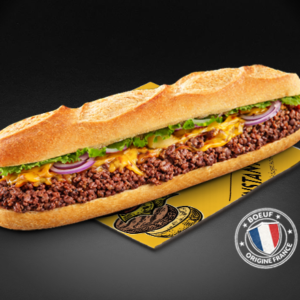 Baguette du Boulanger, Steak Frais (130gr) de bœuf origine, sauce burger exclusive, salade, cornichons, oignons confits maison, bacon de bœuf, cheddar maturé