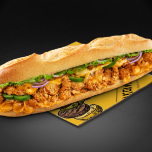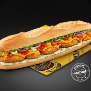 Baguette du Boulanger, Steak de Poulet haché et pané (130gr) fait maison, sauce tartare, salade, oignons rouges, poivrons confits maison, cheddar maturé