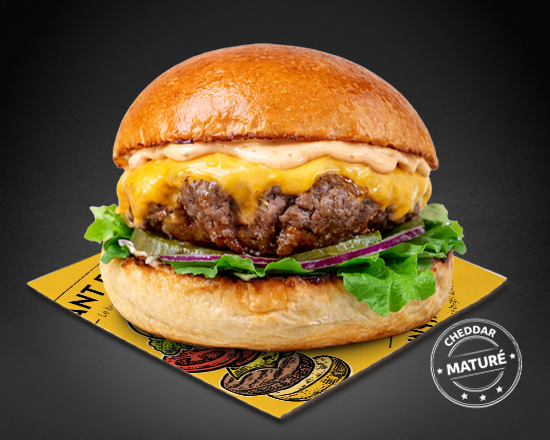 Pain Brioché Artisanal, Steak Frais🥩(130Gr) de Bœuf origine 🇫🇷, Sauce Burger exclusive, Cheddar maturé, Salade, Cornichons, Oignons Rouges.